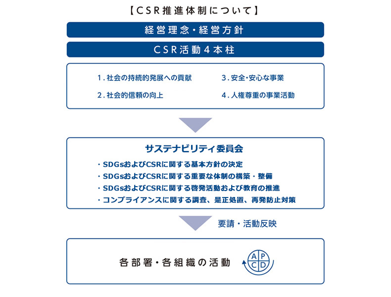 「コンプライアンス」、「リスク・クライシスマネジメント」、「公正な取引」の取組みを推進し、健全で社会から信頼される事業活動を行います。